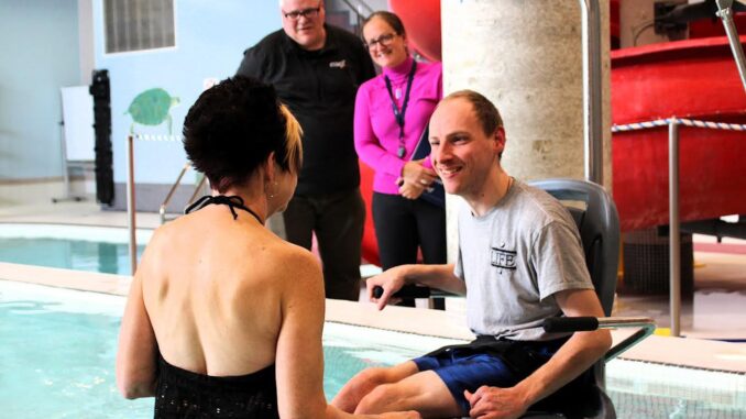 Members of LIFE try out the new accessible pool lifts at the Essex Recreation Complex last week. Sylene Argent, Local Journalism Initiative Reporter